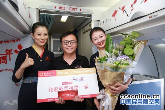 图:ARJ21飞机第10万名旅客张先生获赠成都航空ARJ21飞机往返免费机票一张,并与乘务组合影留念