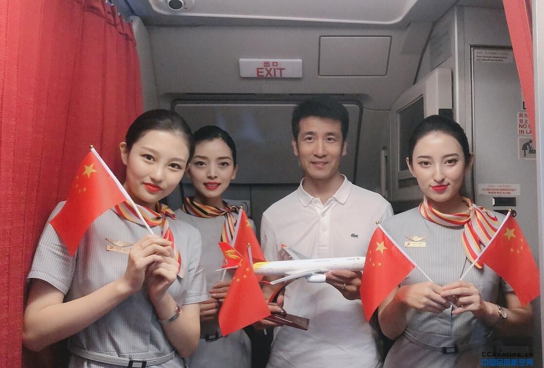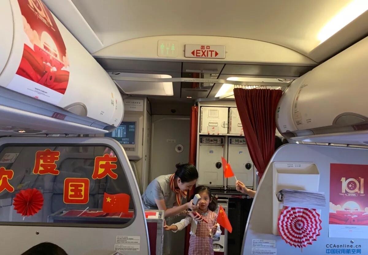金秋时节,满载喜悦。为庆祝新中国成立70周年,2019年9月30日,首都航空在JD5859北京-南昌-海口的航班上开展主题为“五星红旗耀客舱”的欢度国庆机上活动。