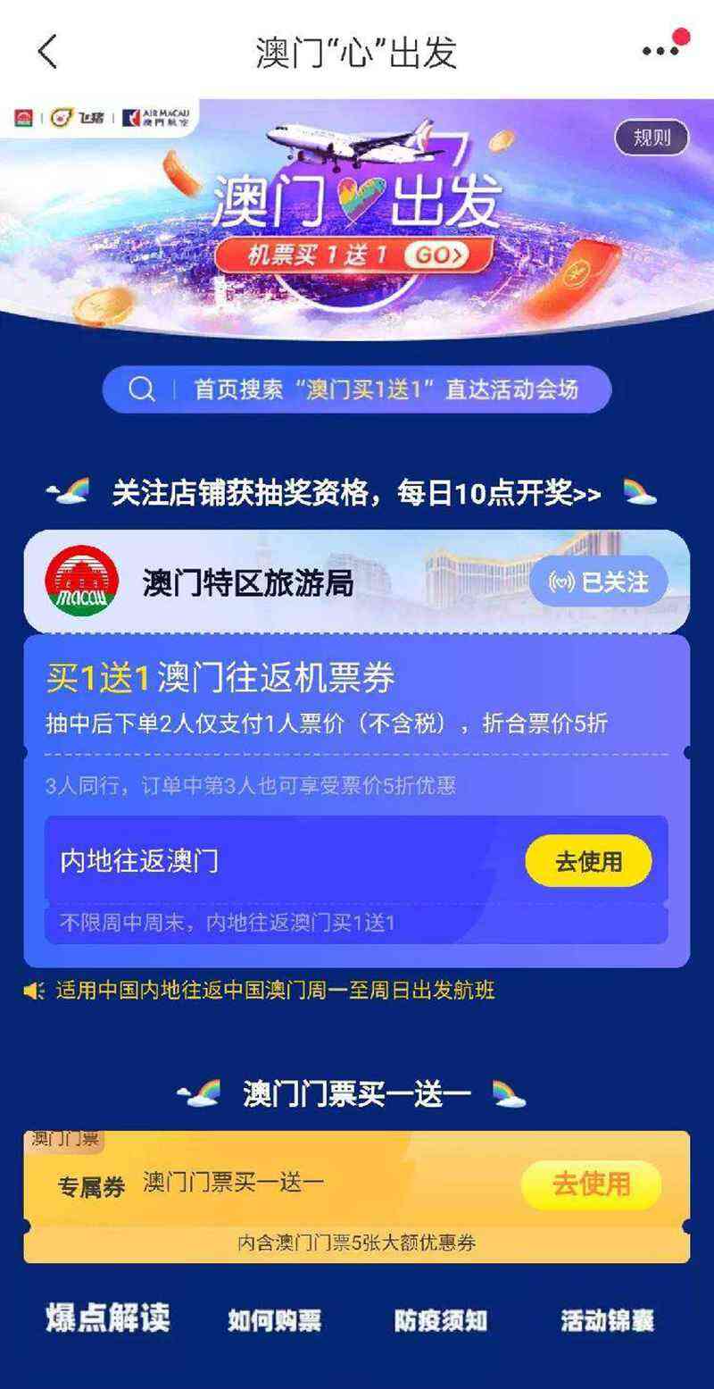 在具体旅游优惠举措方面, 截止12月31日,澳门特区政府助力澳门旅游恢复,每天上午10点,飞猪平台/APP搜索:澳门买1送1,领取买1送1券,选乘航空重庆直飞澳门航班,2-3乘机人一起下单,即可享受半价(2-3人使用),购票日期:即日起至12月31日,出行日期:即日起截止2月28日(春节期间不适用)。