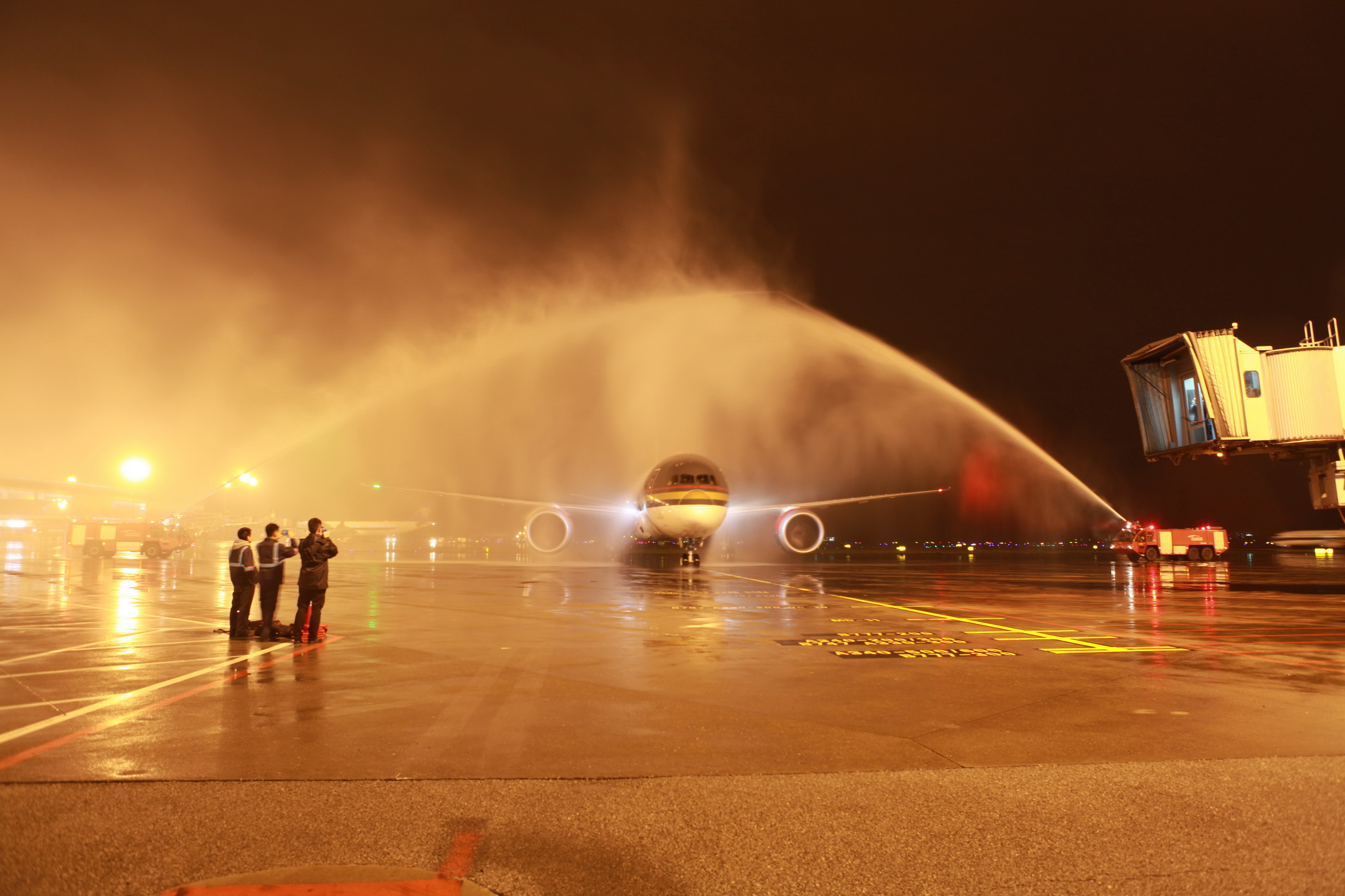 3月21日晚上20点45分,执行安曼-曼谷-广州首航任务的RJ180航班抵达广州白云国际机场。按照国际惯例,白云机场给予约旦首航飞机最高规格的礼遇—水门仪式。飞机在滑行中穿过消防车车喷洒出的巨大水幕,缓缓停靠在109号廊桥。消防安保管理中心派出四大队、六大队两辆消防车共8名消防指战员参与了本次任务。