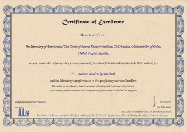 6月20日,中国民用航空航油航化适航审定中心(以下简称“审定中心”)收到实验室能力验证研究中心(IIS)寄来的能力验证“优秀证书”。这表明审定中心今年4月份首次参加IIS组织的100LL航空汽油能力验证取得满意结果。这是我国首次参加100LL航空汽油产品领域的国际能力验证活动,是我国在该领域的一大突破。