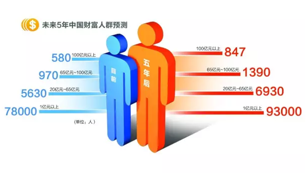 胡润百富联手民生金融租赁联手最新发布的《中国公务机行业特别报告》指出,算上隐形财富,中国大陆拥有100亿人民币以上的人数有580人,拥有10亿美元(约65亿人民币)以上的人数有970人,拥有20亿人民币以上的人数有5630人,拥有1亿人民币以上的人数有7.8万人。