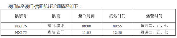 据澳门航空公司负责人介绍,贵阳至澳门航线开航初期每周二、五、日运营三个往返航班,由空中客车A320系列飞机执行。贵阳至澳门航线全程飞行时间约为1小时50分钟,此航线的开通大大地缩短了两地人员、物资的路程时间。