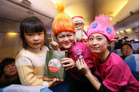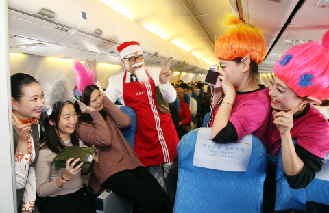 当客机飞行平稳后,机舱内响起了欢快的圣诞歌曲,让整个客舱变得暖意洋洋。“女士们先生们,今天您乘坐的是缤纷魔法号航班。我们的航班上来了几位神奇的朋友。一位是大家特别熟悉的肯德基上校先生。今天,他特地打扮成花样圣诞爷爷,在千米高空和大家见面。还有两位,也是大有来头。这就是肯德基和东方梦工厂合作的动画电影《魔发精灵》中可爱的魔发精灵玩偶,他们把充满魔力、尽情自在的圣诞体验也逮到了我们的机舱。”温馨的航班上,空姐甜美的播音有些与众不同。6岁的小朋友跟着爸爸妈妈从哈尔滨返程回到天津,当他听到“魔法号”显得格外兴奋。