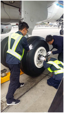 南航三亚航线车间彭贵斌在为B-6786飞机做短停维护时发现4#主轮有扎伤迹象。在他对轮胎进行气密测试后,轮胎有轻微漏气现象。主轮扎伤已超过标准,彭贵斌立即通知调度员并安排技术人员筹备更换主轮的工作。面对短停时间紧,人员不足等困难,航线车间依照APS理念有条不紊进行着各项工作。