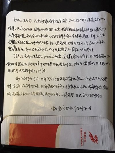 “女士们,先生们,我是本次航班的乘务长吴微,我们的空中广播通常到此就结束。但就在昨晚,这片土地刚经历地震,我们通过媒体看到无数九寨沟的人等待救援,而在今天的航班上我们有幸承载几名特殊旅客,其中六名前去震灾的救援人士和两名记者。所以恳请借用大家的时间,为这几位明知震后有危险,却义无反顾前往的平民英雄送上一首歌,以表敬意。