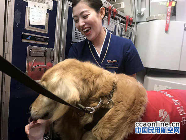 到达指定座位,莎莎温顺的蜷伏在主人的脚下,默不出声。乘务员还专门为莎莎准备了它爱吃的火腿肠,莎莎懂事的抬起头用温柔的大眼睛看着空姐,像是在对空姐们提供的服务表示感谢。同机的旅客对导盲犬充满了好奇和好感,莎莎一直陪伴在主人身边,不叫不闹,恪尽作为一只工作犬的职守。
