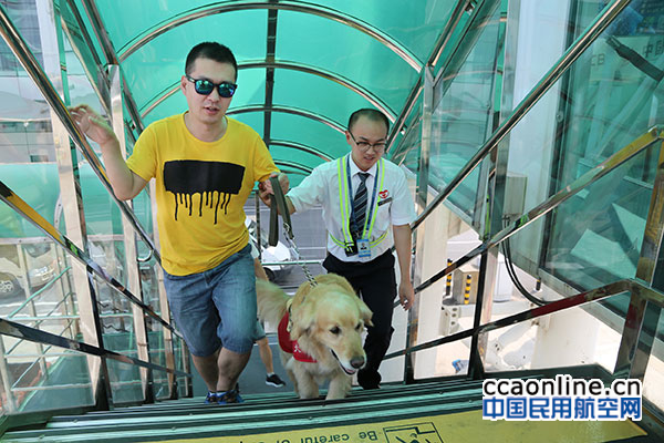 中国民用航空网通讯员时晨、柯昌乐、王祎讯:8月9日下午14:45分,导盲犬“莎莎”和它的盲人“爸爸”文世鹏在大连搭乘南航CZ6427航班飞往长沙探亲。考虑到文先生行动不便,南航专门为其预留了经济舱第一排靠过道的座位。在大连机场,莎莎和它的主人享受到了南航大连分公司为其提供的“特殊服务”。