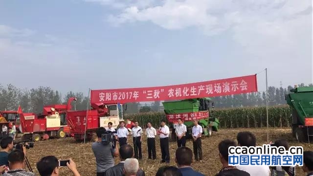 中国民用航空网讯:为集中开展“三秋”主要农机化新装备、新技术作业演示,河南省安阳市农机管理局于2017年9月6日,在安阳市高庄乡召开了安阳市“三秋”农机化生产现场演示会,安阳市委市政府,安阳市各县(市、区)农机局,各分管业务科室、推广站、农机合作社,市局各科室站合计百余人参加演示会。