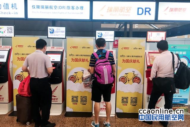 9月29日,瑞丽航空DR5313(昆明-恩施-天津)航班装饰一新,本次航班机舱内装饰均使用ofo 小黄车定制版车型“厉害了我的国”设计元素,航程中还营造了趣味互动环节,以爱国话题与乘客产生交流。