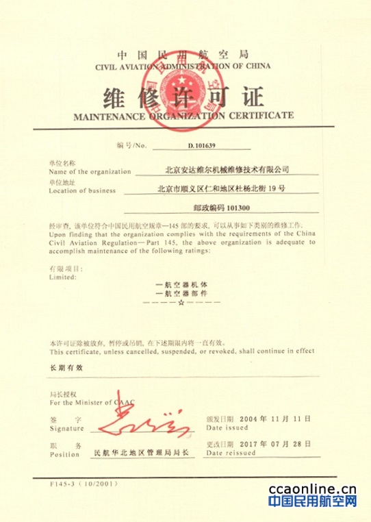 中国民用航空网讯:近日,北京安达维尔机械维修技术有限公司(Andawell)获得了民航华北地区管理局颁发的最新维修许可证。此次维修许可证变更是在安达维尔原有的航空部附件维修资质基础上,增加了航空器机体维修资质,这标志着安达维尔成为民航华北管理局批准的首家拥有机体维修资质的CCAR-145维修单位。