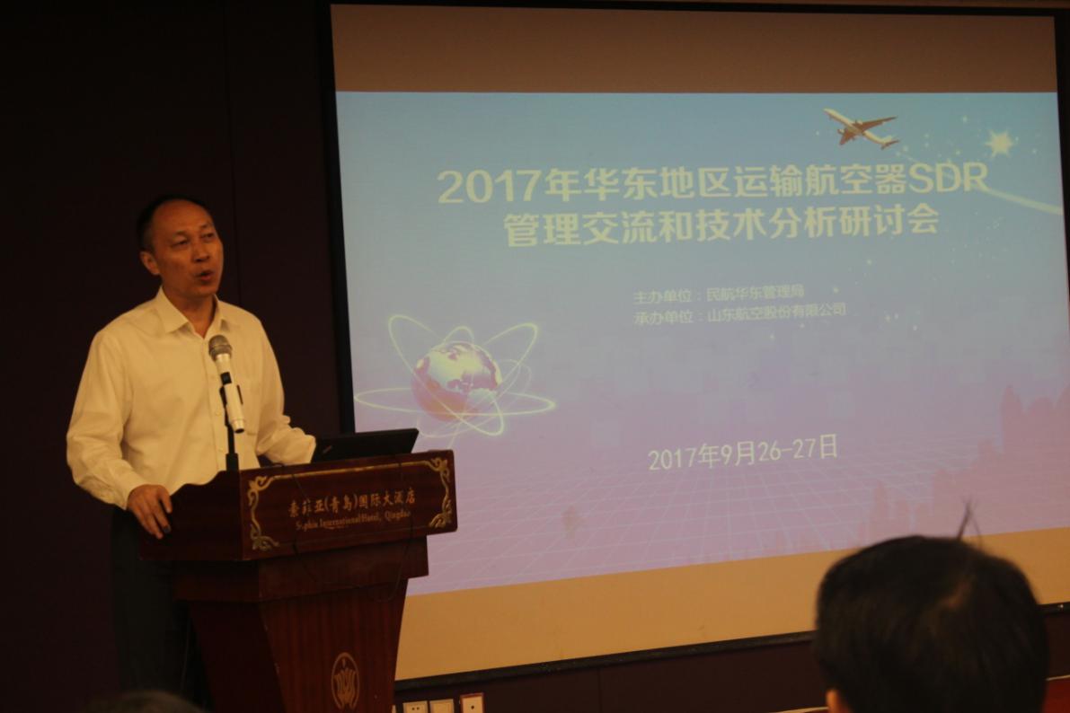 中国民用航空网通讯员张建新讯:9月26至27日,由民航华东管理局主办、山东航空股份有限公司协办的2017年华东地区运输航空器SDR管理交流和技术分析研讨会在青岛召开。民航华东管理局局长蒋怀宇出席会议并讲话,山航股份副总经理于博出席会议并代表山航致欢迎辞,山航股份总工程师刘朝磊出席会议。