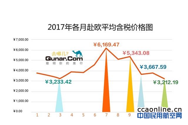 一年12个月中,3月赴欧机票票价低,7月票价高