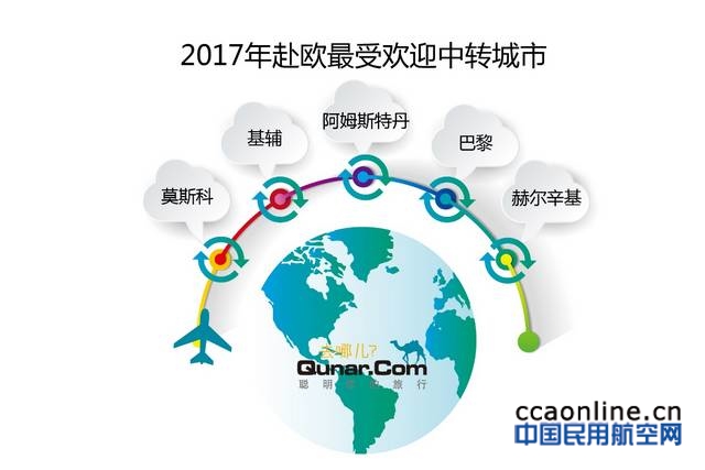 最受去哪儿旅客欢迎的欧洲中转城市为莫斯科、阿姆斯特丹、巴黎、赫尔辛基和法兰克福。