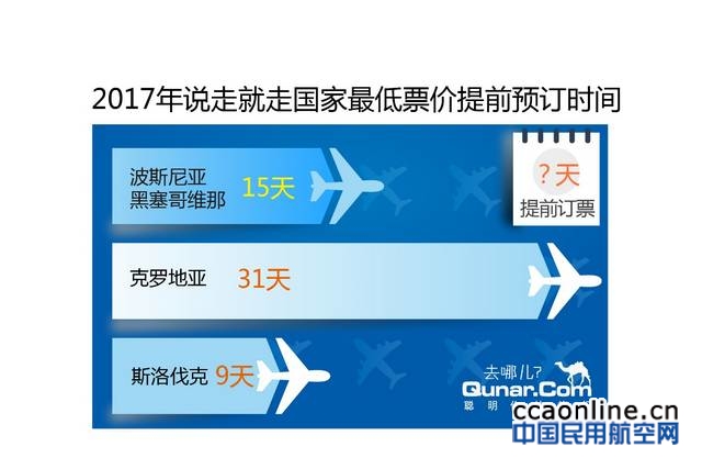 哪些国家可以说走就走?去斯洛伐克最便宜的机票出现在提前9天,而去波黑的特价机票提前两周,去克罗地亚提前一个月订票就能买到便宜的机票。
