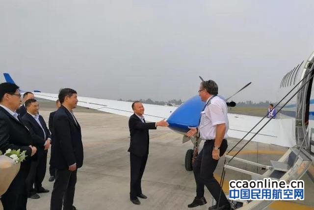 西华航空董事长曾波与西华航空总经理李大军迎接机组人员