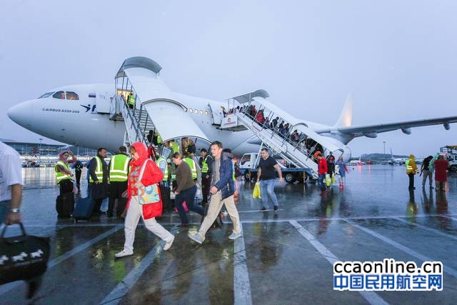 来自圣彼得堡的旅客走下舷梯,这架艾菲航空A330还是裸体涂装