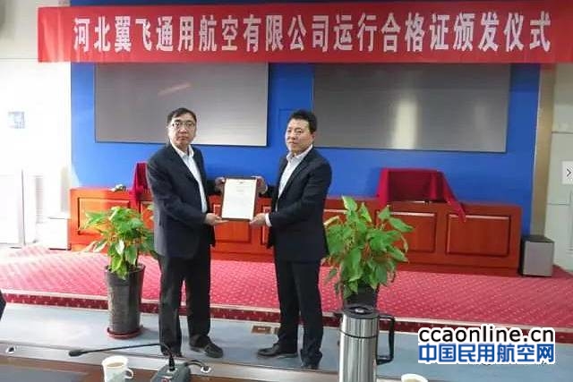 民航河北监管局局长吕志农向河北翼飞通航颁发运行合格证
