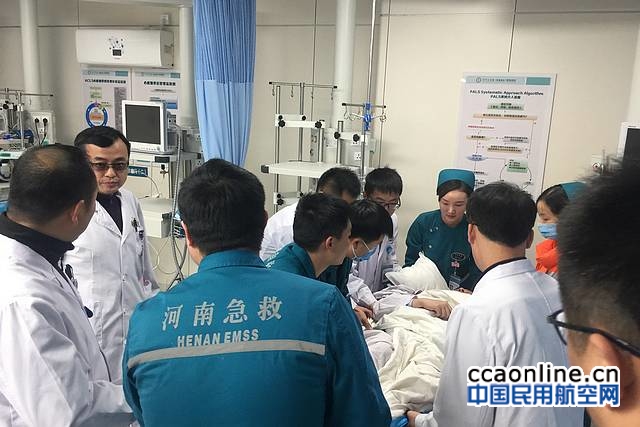 本次急救任务,郑大一附院和金汇通航无缝衔接,随机医护为郑大一附院经过专业培训的急救人员,院方为急救开辟绿色通道,病人送抵急诊抢救区后,后被转入心内介入手术室进行后续手术。