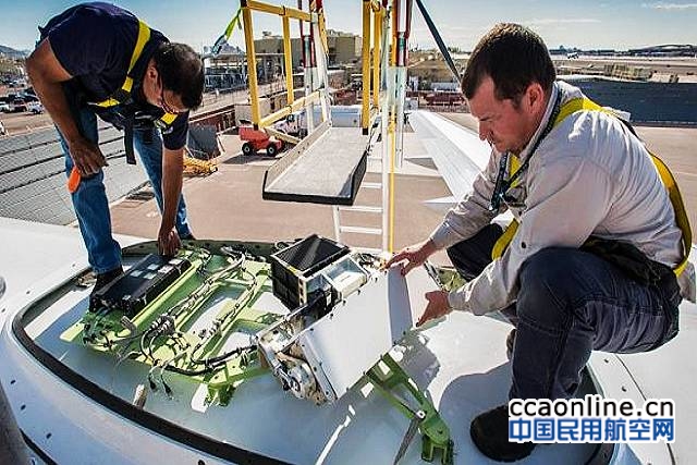汉莎技术机务工程师在飞机顶部安装卫星接收天线