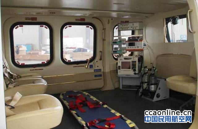 此次落地宁波的直升机是金汇通航的AW139机型专业医疗构型直升机,覆盖半径为250公里。直升机的内部并非只有担架,配有呼吸机、除颤监护仪、注射泵、吸引器等,犹如一间迷你重症监护室,可保证飞行途中患者的生理机能稳定。