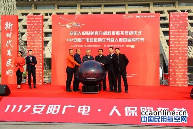 中国民用航空网讯:11月17日上午,河南安阳人保财险直升机救援服务启动仪式、1117安阳广电超值购车节暨人保首届购车节在东区两馆广场盛大启幕。中国人保财险安阳分公司联合上海金汇通用航空股份有限公司(以下简称“金汇通航”)、安阳广播电视台、安阳保险行业协会共同启动安阳直升机救援服务。