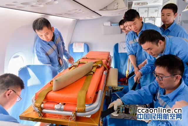 下午14:00,飞机前序航班一落地,厦航飞机维修工程师马上上机,迅速拆除最后三排座椅的中间座位安装担架。机组成员也提前进场,确认担架安置情况,做好准备。