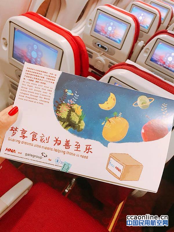中国民用航空网讯:“当您享用今日的航班便餐时,世界一角的难民也将收获关怀,海航集团将助力联合国世界粮食计划署,为徘徊于温饱线的人们送去1300万份餐食。一餐一食,改善生境。”近日,海航集团旗下海南航空等航空公司国内外航班统一配发了主题为“梦想食刻,为善至乐”的爱心餐盒,餐盒以卡通的设计,不经意的方式,温暖而有力的文字,唤起了很多人心中的公益意识。
