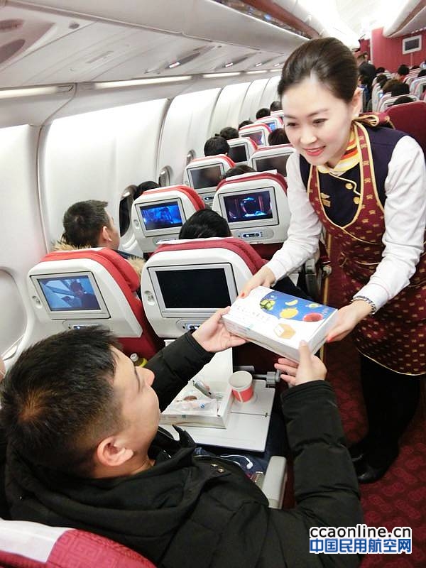 海航集团旗下海南航空乘务员为旅客派发爱心餐盒