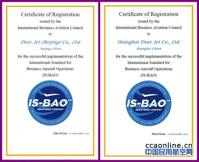 中国民用航空网讯:2017年12月25日,金鹿(北京)公务航空有限公司与金鹿(上海)公务航空有限公司(以下简称金鹿北京与金鹿上海)接到来自国际公务机协会IBAC与国际著名公务机资质认证公司Wyvern的双重贺函,北京金鹿与上海金鹿以“近零不符合项”的超高标准双双顺利通过了IS-BAO Stage II认证和Wingman认证审核。从IS-BAO一段到二段的认证,金鹿公务仅用了一年半不到的时间,创造了一个新的历史。