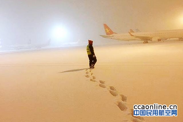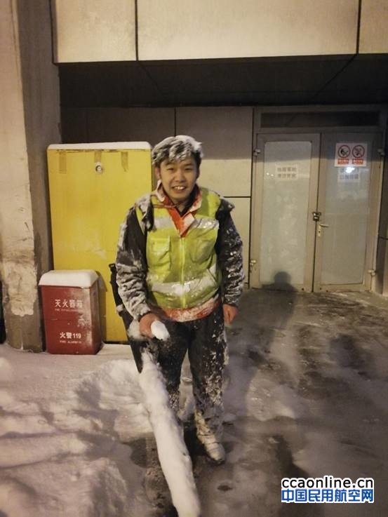在大型扫雪车顾及不到的地方,为了道路标线清晰,海航技术机务手持吹雪机,为飞机开路,浑然不知自己已成“雪人”