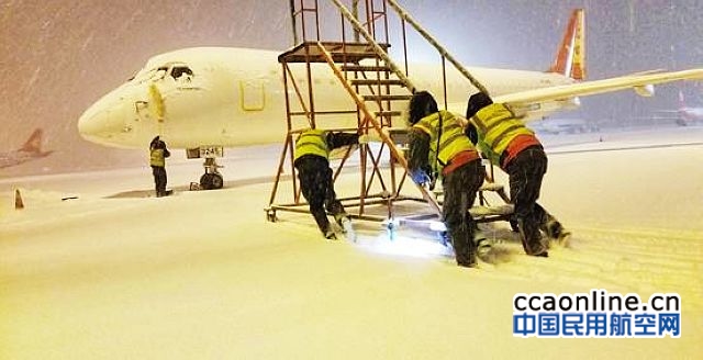 中国民用航空网通讯员麻洛齐讯:12月27日至28日,受强冷空气影响,乌鲁木齐市天降大雪。恶劣天气造成乌鲁木齐机场航班大面积延误和取消, 截至28日上午,机坪上积雪厚度已经达到18cm,海航航空技术股份有限公司(简称“海航技术”)新疆维修基地面对来势凶猛的大雪,启动恶劣天气应急保障预案,提前准备,开展清理积雪,飞机除冰等工作,全力以赴保障航班正常出港。