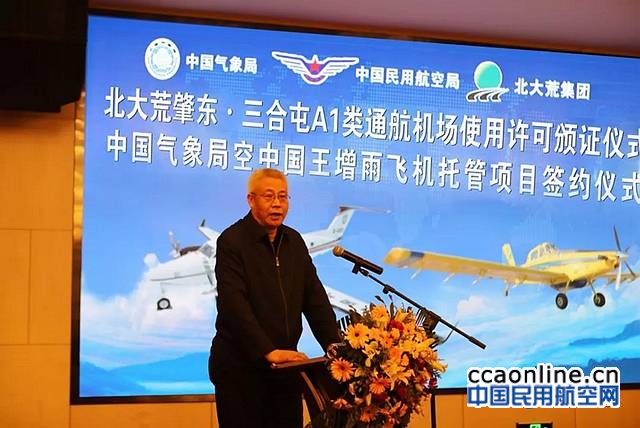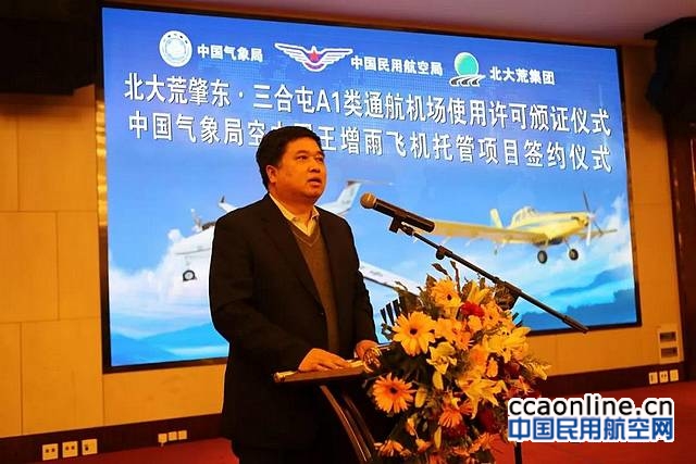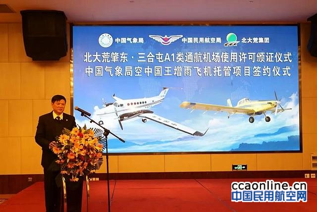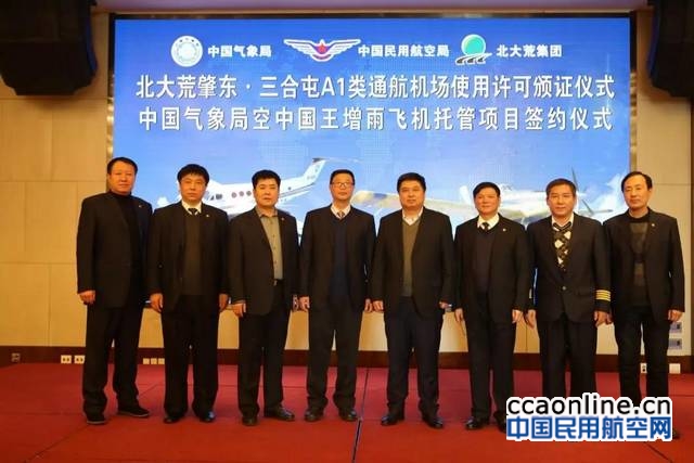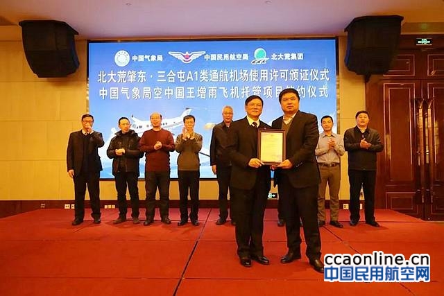 中国民用航空网通讯员张微讯:2018年1月12日上午10点,北大荒通用航空有限公司于哈尔滨隆重举行肇东·三合屯A1类通航机场使用许可颁证仪式和中国气象局空中国王350增雨飞机托管项目签约仪式。气象、民航、农垦、空军、地方政府及媒体二十余家单位和部门参加了仪式。
