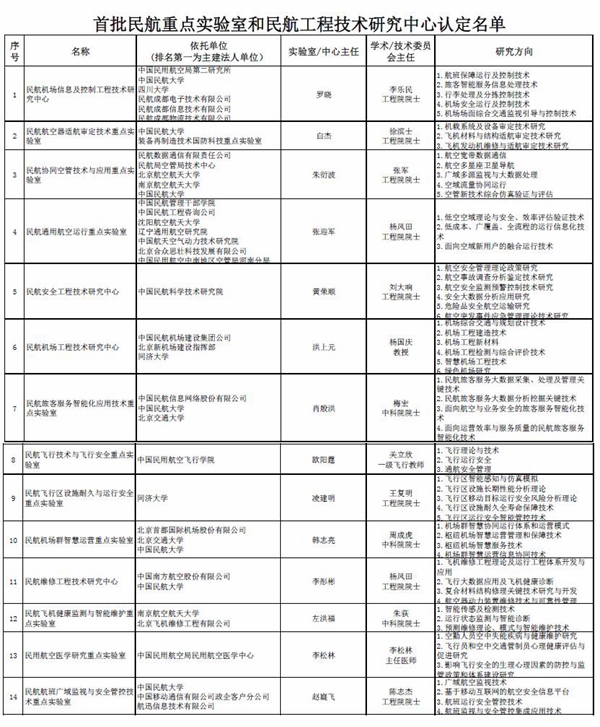 据介绍,全国民航重点实验室(工程技术研究中心)认定工作标准严格,程序严密,体现了开放包容、公平竞争的原则。通过认定的14家实验室和工程中心共涉及主建单位13个(其中,行业内11个,行业外2个),包括10个重点实验室,4个工程技术研究中心,共有11位院士担任学术/技术委员会主任。通过认定的重点实验室和工程技术中心的研究水平和能力在相关领域和方向居于国内领先地位,为民航安全发展提供较好的技术支撑。