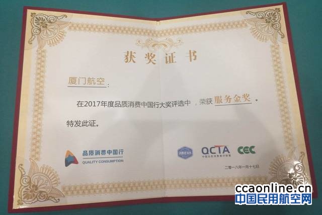 中国民用航空网通讯员王静雯讯:1月17日,由消费者报告、中国品质消费测评联盟和CEC消费者体验中心联合主办的品质消费中国行2017年度大奖评选结果在京揭晓,厦航荣获首届品质消费中国行2017年度服务金奖,同时也是服务业和民航业唯一获此殊荣的企业。