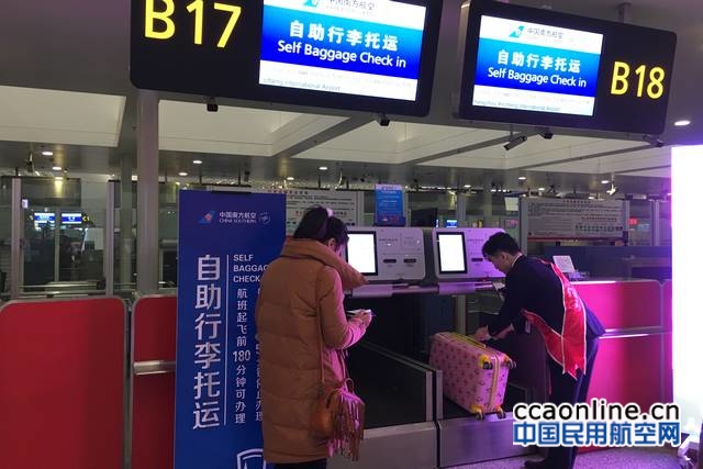 为应对春运客流高峰潮,河南公司地服部增派服务人员协助和引导旅客,为旅客进行宣传和讲解,使更多的旅客了解和学会使用自助行李托运设备,享受到南航方便快捷的智能化自助行李托运服务,舒心踏上春运回家路。