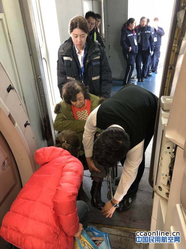 2月17日从长春飞往烟台的航班上,旅客登机前,地面工作人员通知机组有一位特殊旅客乘机,乘务员便提前在舱门口等候,希望能够用体贴周到的服务,为轮椅旅客带来暖心的乘机体验。