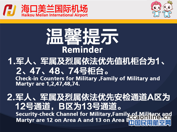 据了解,为深度推进军民的深度融合发展,美兰机场现已将1、2、47、48、74号值机柜台设置为军人、军属及烈属优先柜台,同时将A区安检12号通道、B区安检13号通道设置为优先安检通道。军人、军属及烈属旅客在上述值机柜台办理相关手续时,工作人员将在登机牌上粘贴军人优先标识或栓挂行李优先挂牌,方便后续安检口及登机口等工作人员快速识别。