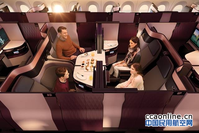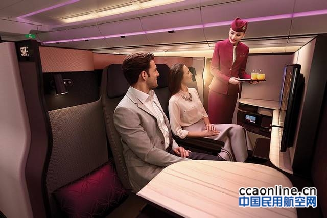 卡塔尔航空商务舱座椅的设计经过仔细考量,其中不乏奢华细节设计,如手工缝制的意大利真皮以及缎面玫瑰金镶嵌,这些细节无不彰显卡塔尔航空商务舱的高端、私密且极具个性。为进一步提升旅客乘机体验,卡塔尔航空还推出了全新的机上餐饮概念,除了精心设计的机上菜单及已有的“点餐”服务外,Qsuite商务舱菜单还将为旅客全程提供小吃拼盘,配上精致的瓷器餐具和刀具,让旅客在35,000英尺的高空体验美食社交。Qsuite还可设置“免打扰”模式,配上美轮美奂的软装以及奢华的床上用品,让乘客得到最佳的睡眠体验。此外,卡塔尔航空联手知名意大利箱包品牌BRIC’S