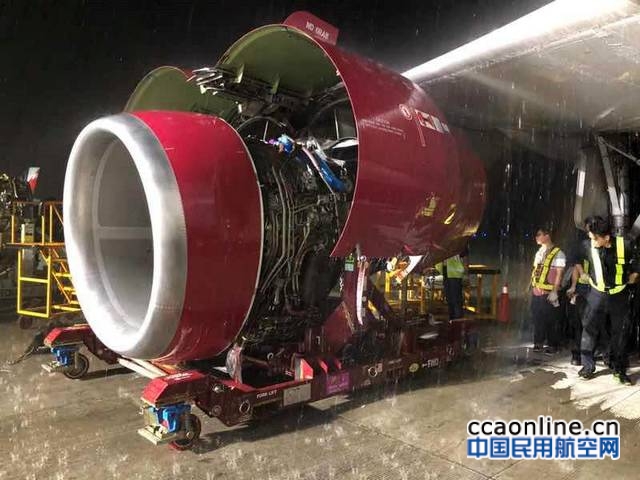 经过与菲当地部门与地面代理公司的多轮协调,3月28日晚间,运载着崭新发动机等航材与设备的伊尔-76运输机终于抵达利博机场。在4月5日夜间完成发动机清关手续之后,全体换发人员共计25人于当晚9时立即投入到紧张复杂的换发工作中。经过一夜的艰苦拼搏,6日早上6点,新发顺利吊装完成;6日中午,发动机前圈吊装及发动机各部件连接完成;当日夜间10点起进行新发动机通电验证、慢车、大功率验证及后续的排故工作。至7日早上6点,经连续34小时的不懈努力,发动机换发部分工作完成,发动机工作状态正常。8日下午4时,工程部就前期运至卡利博机场的大量工具、航材与当地海关一起进行逐一清点,并在海关的监督下完成装机工作。