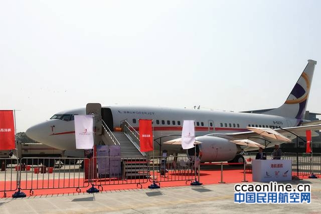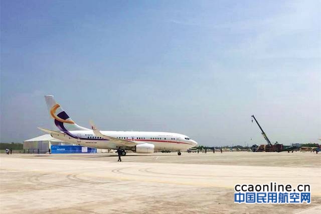 中国民用航空网讯:2018 年 4 月 27 日,2018 郑州航展在上街机场盛大开幕。参展、参演者来自 34 个国家、3 个地区和 1 个国际组织,除普通通航飞机外另有 18 架公务机整齐亮相,俱创历届郑州航展之记录。其中,海航通航选派旗下金鹿公务航空波音 737BBJ 公务机参展,一登场即成全场焦点。