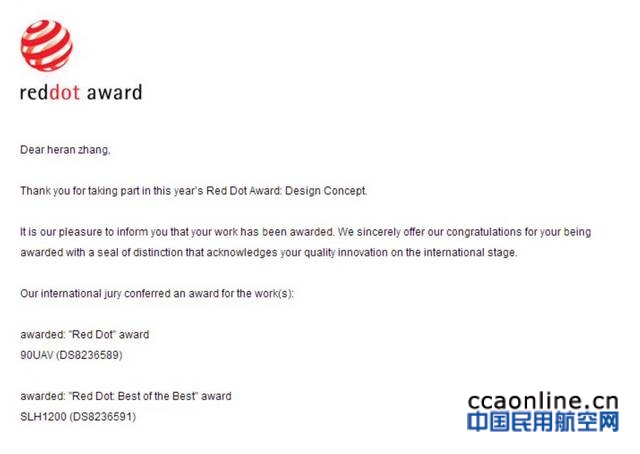 同时,星环航空SLH-90T涡轮轴无人直升机因将优秀的工业设计与良好的使用性能相结合,也与战略合作伙伴亚美森工业设计(Asia-Art Design)共同荣获2018红点奖(Reddot Award Winner )。