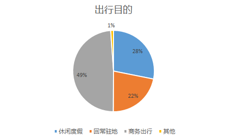 旅客出行目的:商务出行占比49%,休闲度假占比28%,回常驻地占比22%,其它占比1%。由此看来商务出行旅客较多,其次是旅游休闲度假。