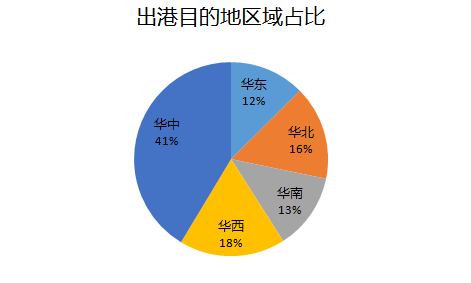 出港目的地区域华中地区占比41%,华西占比18%,华北占比16%,华南占比13%,华东占比12%。