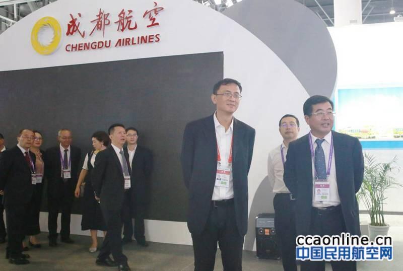 图:四川航空集团党委书记、董事长李海鹰在成都航空党委书记、董事长汤劲陪同下参观成都航空展区