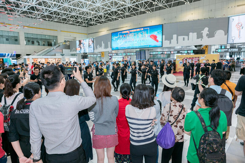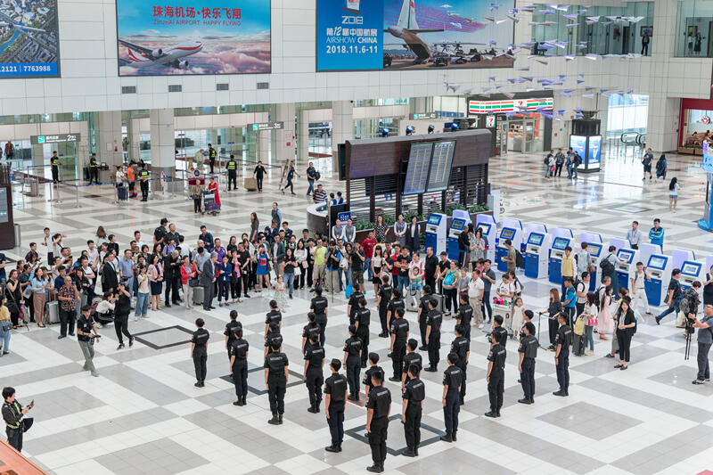 中国民用航空网讯:5月29日上午10点多,珠海机场如往常一样繁忙,突然,出发大厅响起了一阵整齐的步伐,旅客们循着声音好奇地观望,只见两排整齐划一的方队分别从东、西指廊霸气出场。原来,这是珠海机场精心策划的一场快闪演出。