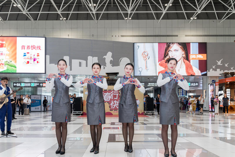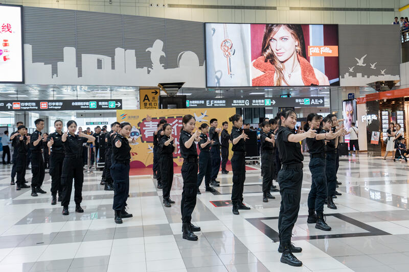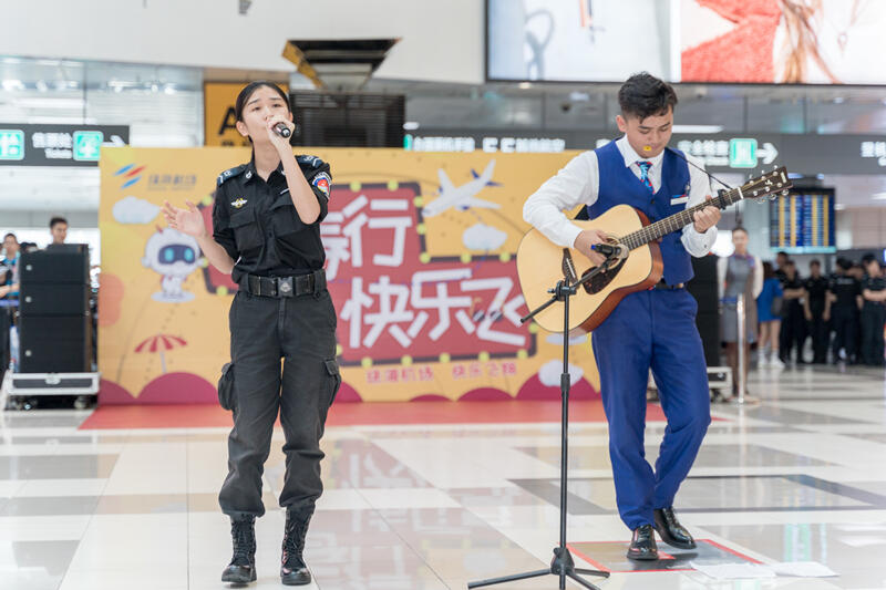 演出中,来自珠海机场安检站、旅客服务部、机坪服务部、消防救援部、商务经营部贵宾厅等9个部门共计70余名员工身着全新制服惊艳亮相,为旅客们带来了青春活力的歌舞及风采展示。演出吸引了往来旅客驻足观看、拍照,有些旅客更是加入了“快闪”队伍,跟着节拍唱起了歌,现场洋溢着欢乐的气氛。