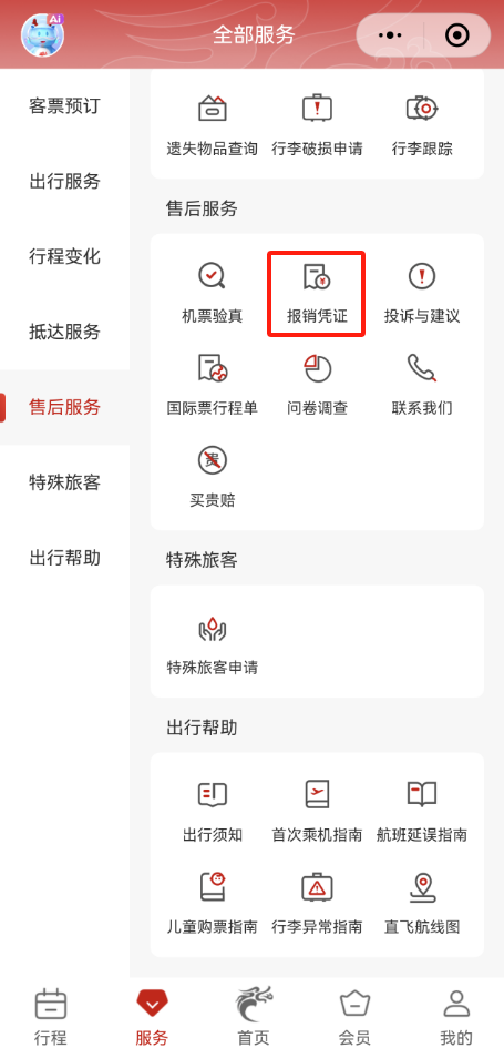 2. 长龙航空APP/微信小程序-服务-售后服务-报销凭证-电子发票(电子行程单);
