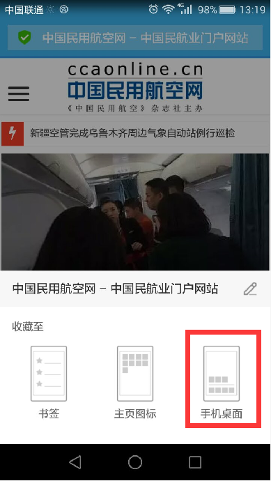2、安卓手机用户可使用浏览器打开中国民用航空网www.ccaonline.cn,选择收藏网址→收藏至桌面即可。
