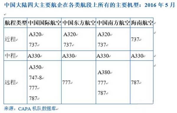 四大航企在远程市场上的差异最大。如前所述,中国东方航空已整合了自己的宽体机需求,其机队内主要为A330与波音777机型,而远程航班则全由波音777执飞,因此其显然有理由需要A350或波音787等中型宽体机。若采购了波音777以外的一个宽体机型,则东方航空便将拥有两种远程机型。中国南方航空目前有三种远程机型(波音777、波音787与A380)。中国国际航空的机型种类数量则较大,共有四种。